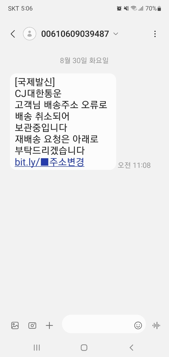 우선, 우리 엄마가 받은 문자인데 배송주소 오류로 인해 배송이 취소되어 보관중이며. 재배송 요청은 아래로 부탁한다고 bit.ly 링크가 적혀져있다.