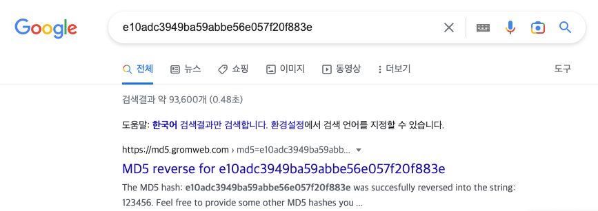 6자리 숫자로 만든 MD5나 SHA256은 구글 검색 시 대부분 보여지기 때문에 인증번호를 우회할 수 있다는 점이 있다.