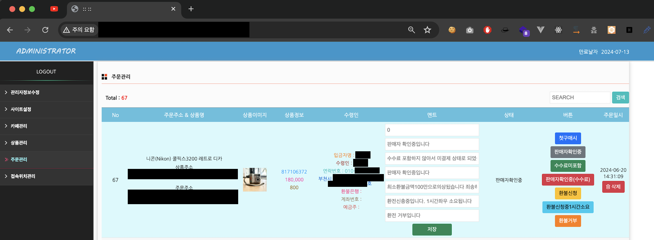 주문관리 메뉴에서는 피해자들이 주문하면 위와 같이 나오며, 상태값이 수수료미포함인 경우 1번 당했다 생각하면 된다.