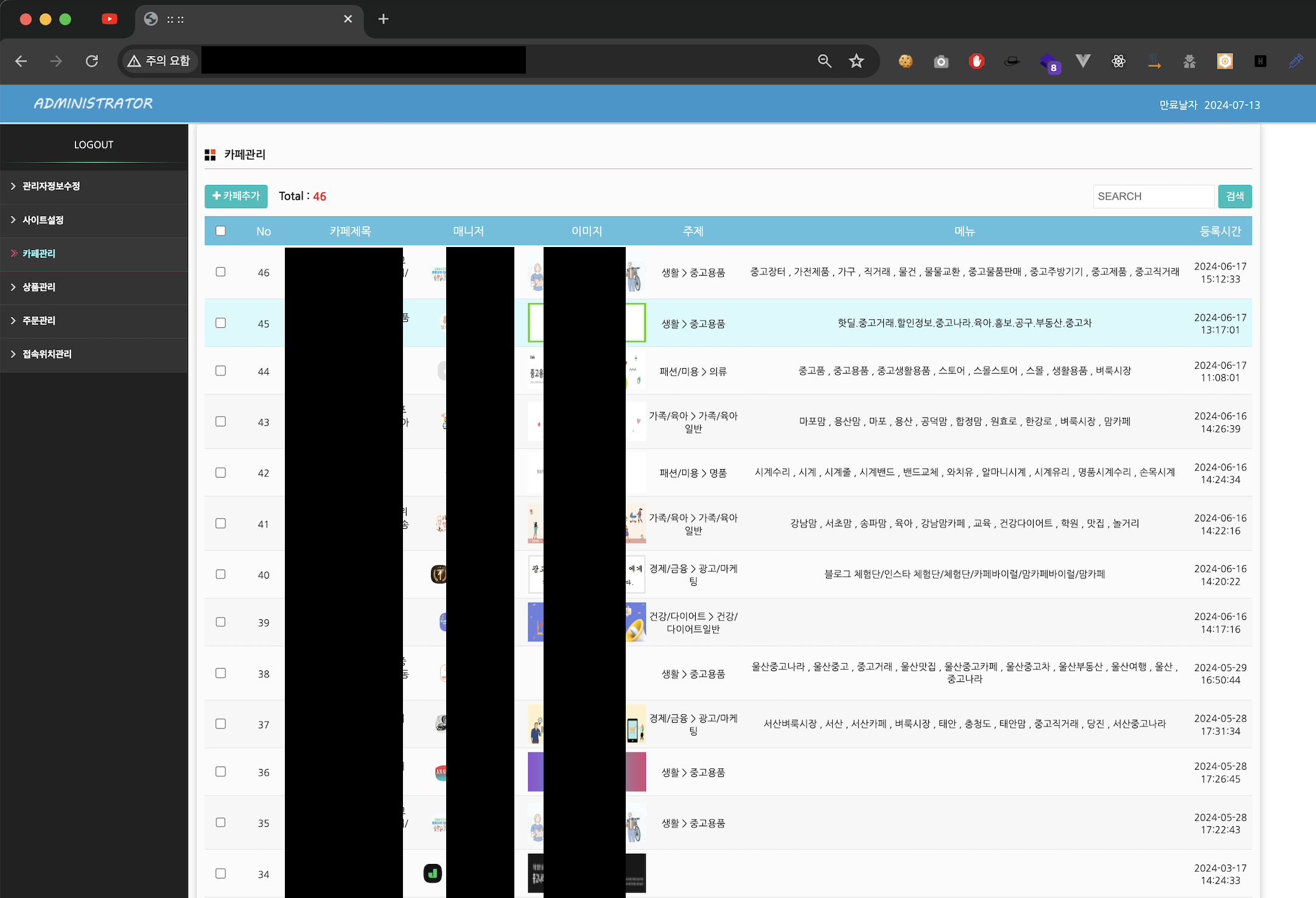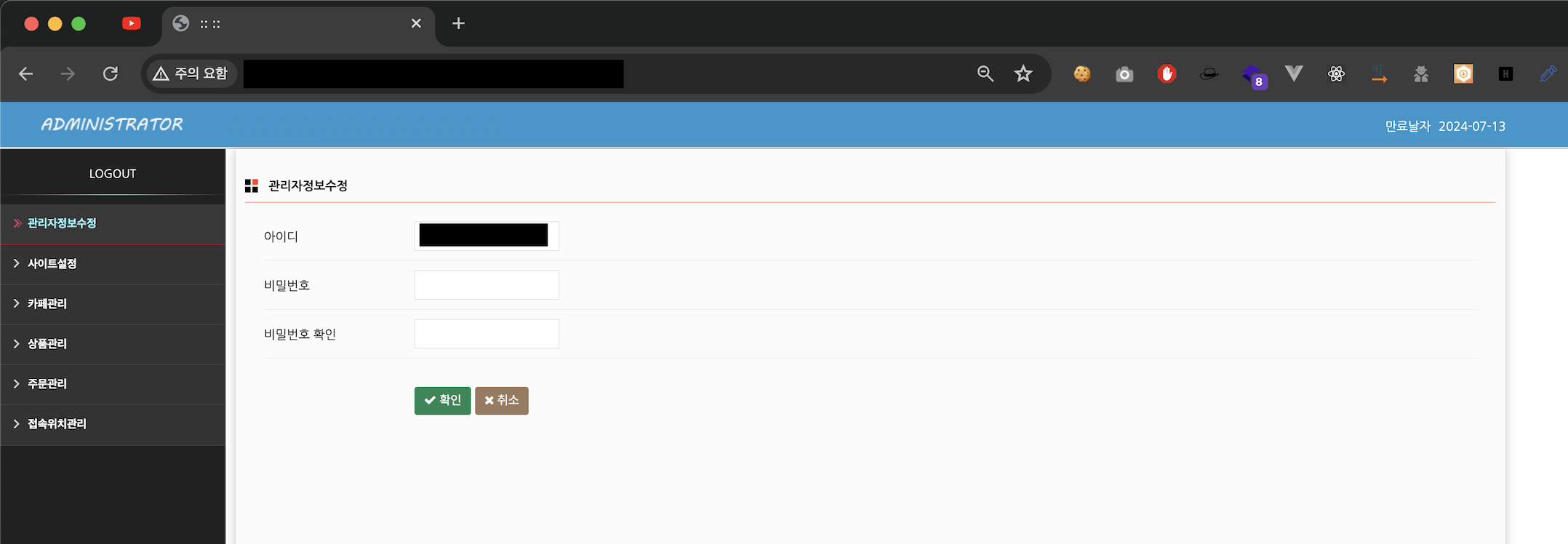 안전결제 관리자 페이지 사이트 내 기능들은 관리자정보수정, 사이트설정, 카페관리, 상품관리, 주문관리, 접속위치관리로 나눠져 있으며 나름 체계적으로 운영된다.