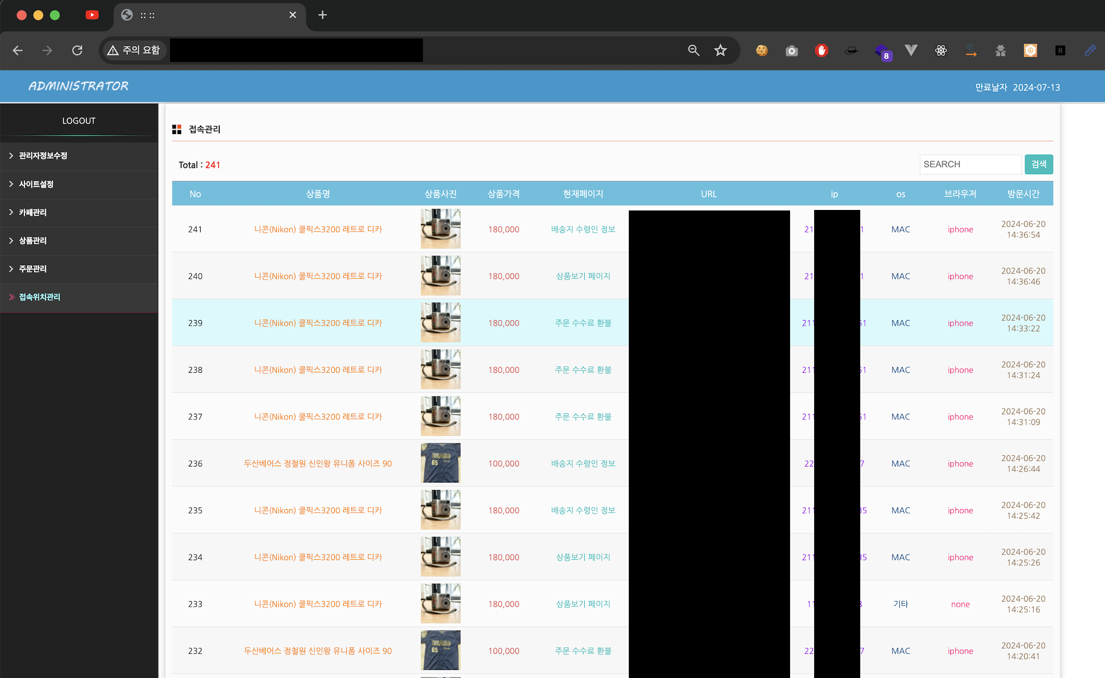 마지막으로 접속위치 관리에서는 피해자들이 접속한 기록들을 확인할 수 있고, 접속 페이지 정보, IP, 운영체제, 브라우저를 수집한다.