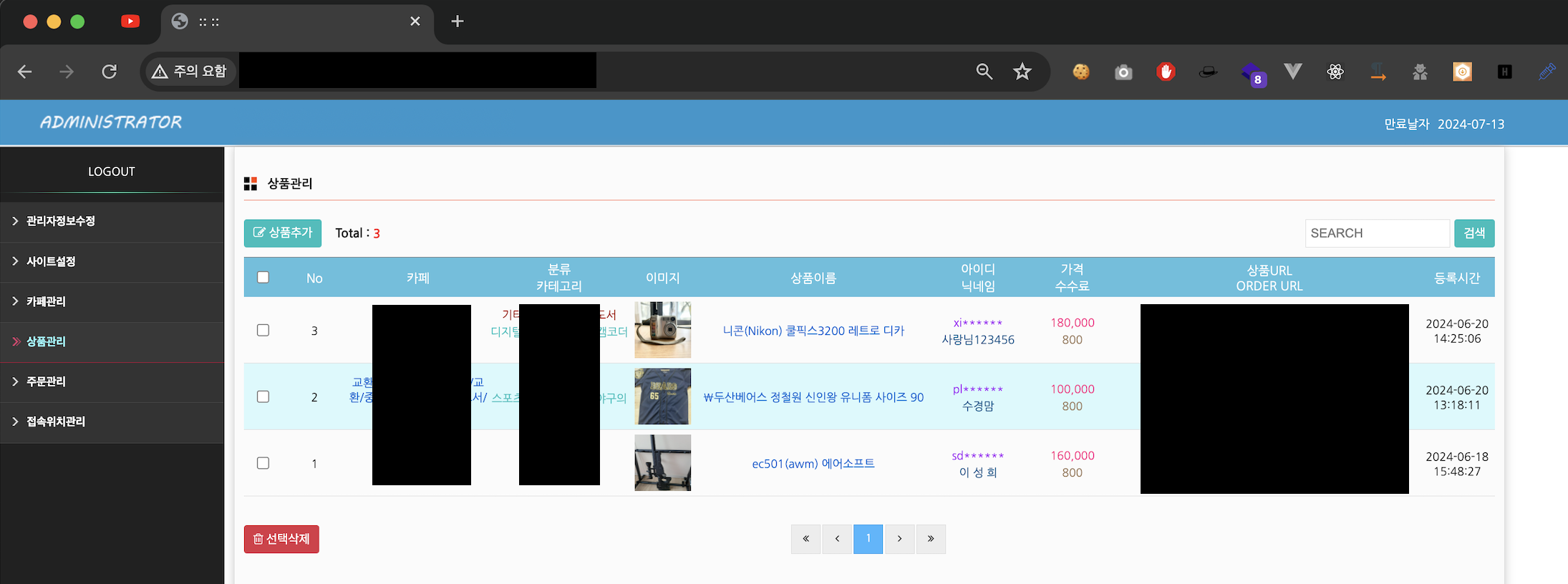 상품관리 메뉴에서는 관리자가 상품추가를 통해 중고나라에 상품을 올린다. 위에 보이는 이미지처럼 닉네임을 보면 **맘이거나, 이름을 사용하는 등의 방법으로 피해자들에게 신뢰를 준다.